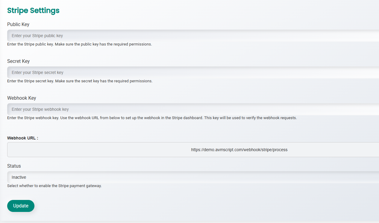 - If any changes are made to your Stripe account (such as updating permissions or modifying the webhook URL), update the configuration in the admin panel immediately.