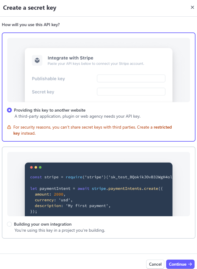 - Enter the Secret Key you created, ensuring it has the appropriate permissions.
